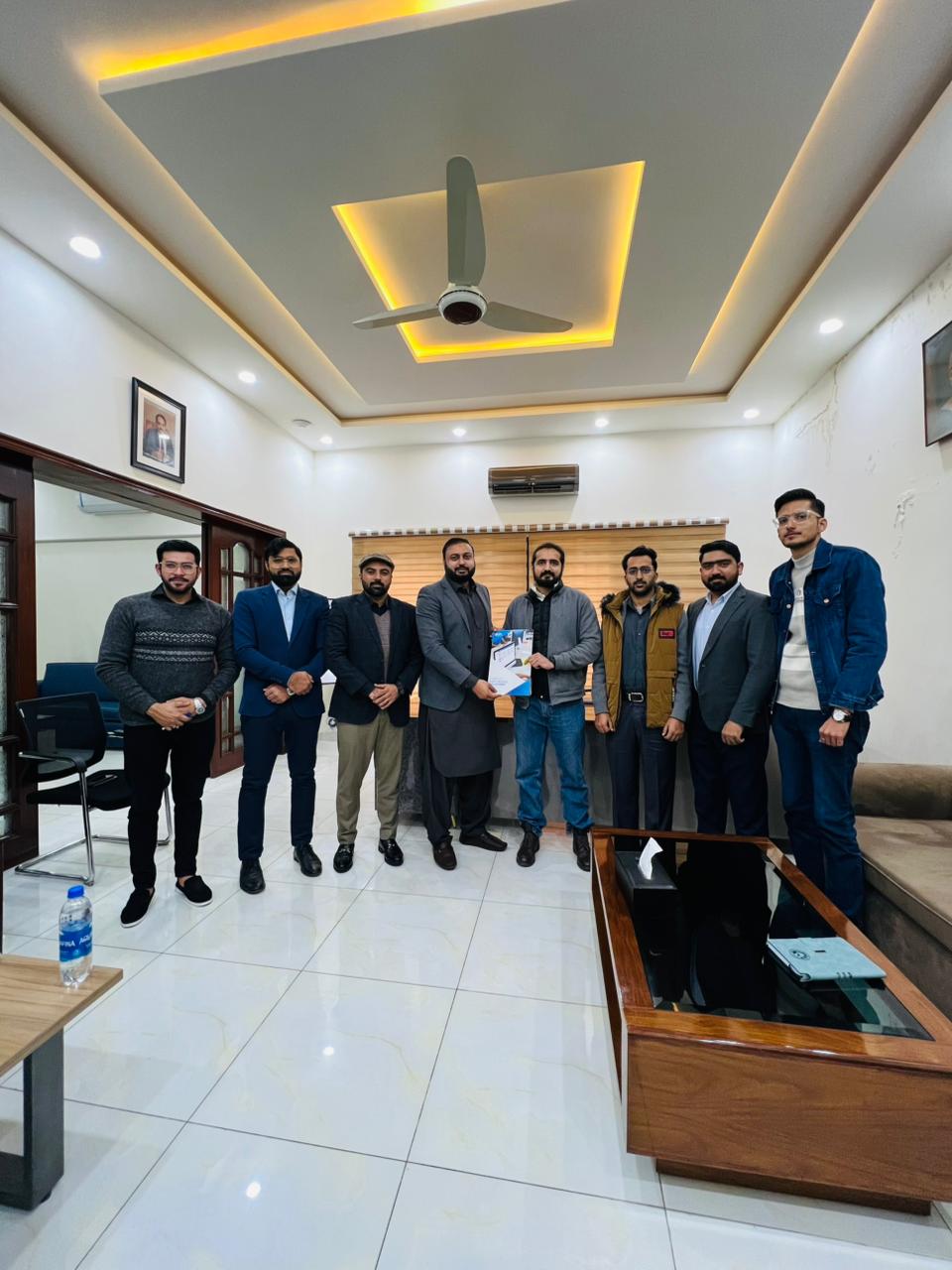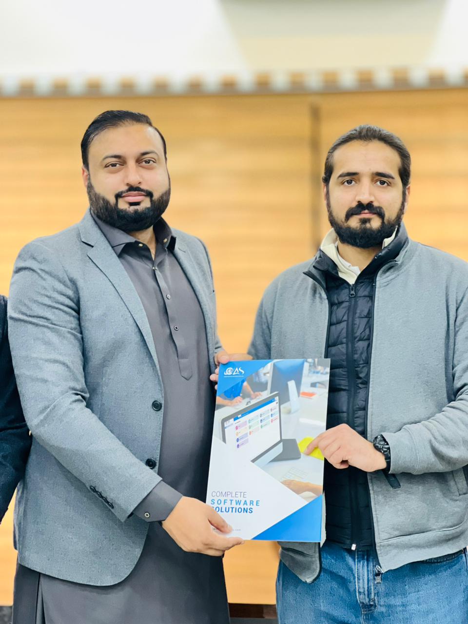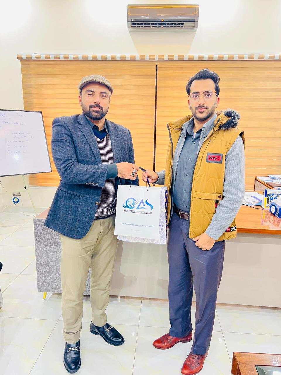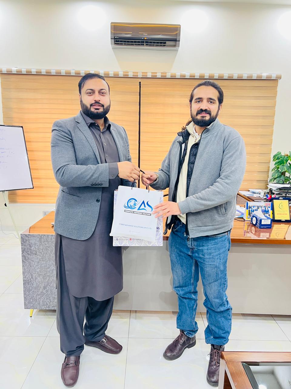 The delegation included Dr. M. Abdullah Qazi (BDS, MMEd, PhD), Mr. Asad Ali (LMS Manager), and Mr. Bilal (Network Administrator). They met with Cyber Advance Solutions’ General Manager Haseeb Khan, Deputy Manager Sales & Marketing Rao Abdul Wahid, Additional Manager Sales & Marketing Skindar Hayat, Senior Marketing Executive Daniyal Akmal, and Deputy Manager Support & Implementation Bilawal Maqsood.
