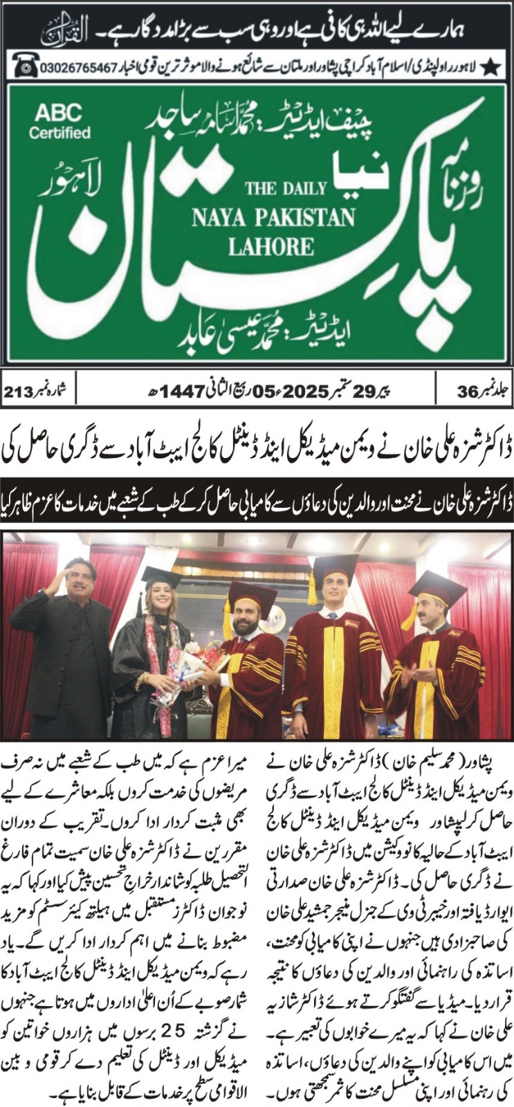 Women Medical & Dental College proudly organized its Convocation for Batch 2011–2024 on 27th September 2025. All MBBS and BDS graduates joined this memorable occasion, where position holders were honored with Gold Medals. We extend our heartfelt gratitude to the Vice Chancellor KMU and the Registrar for gracing the event as our esteemed Chief Guests. The faculty members were also recognized with Lifetime Achievement Awards for their dedication and service. Special thanks to our alumni and their parents for making this day unforgettable.